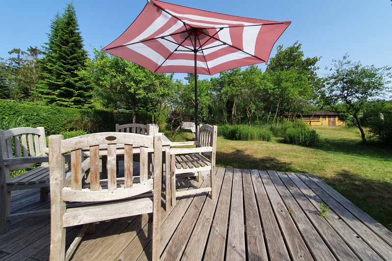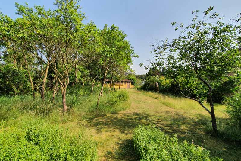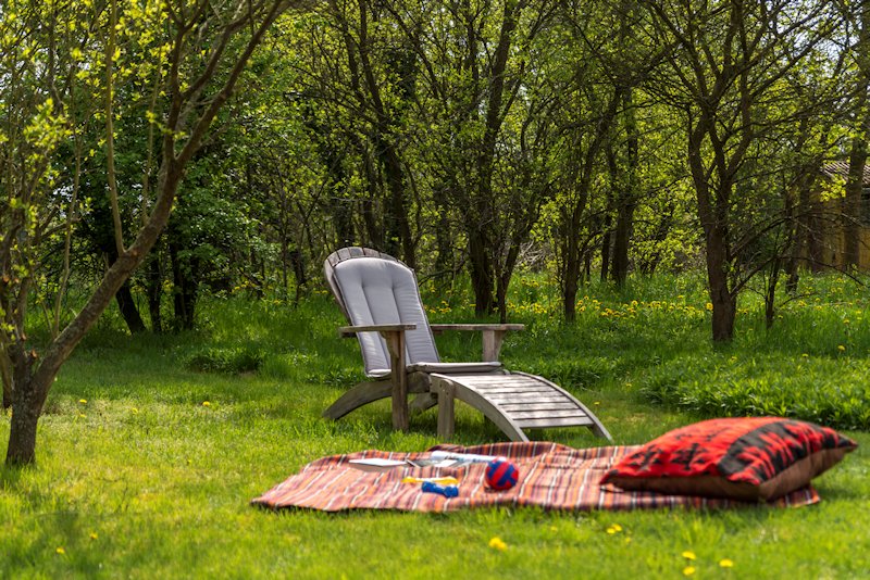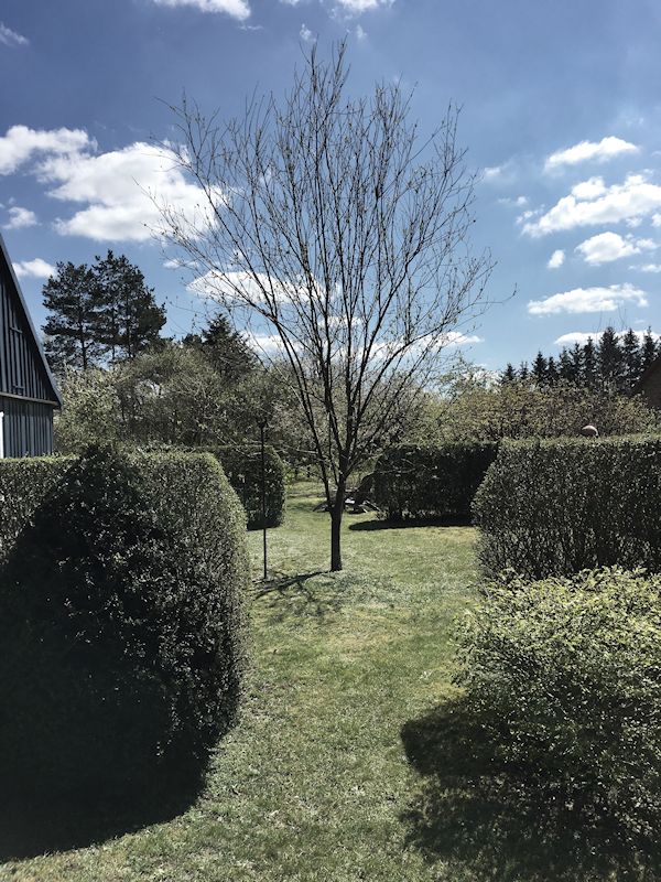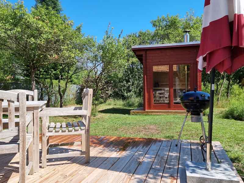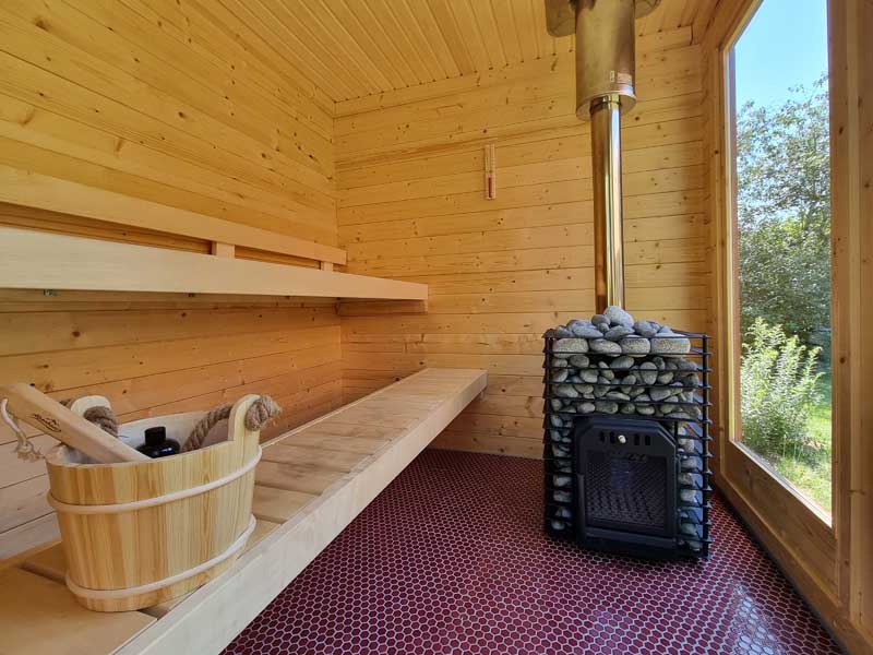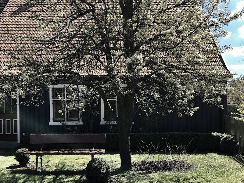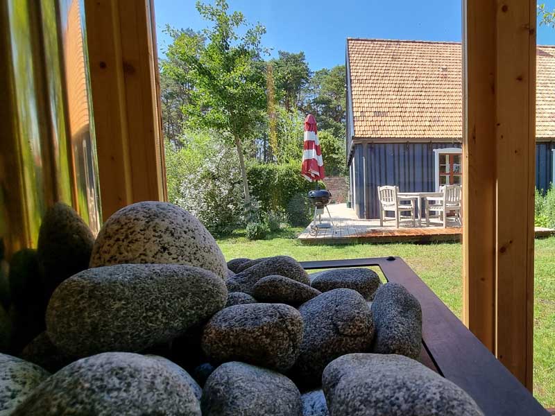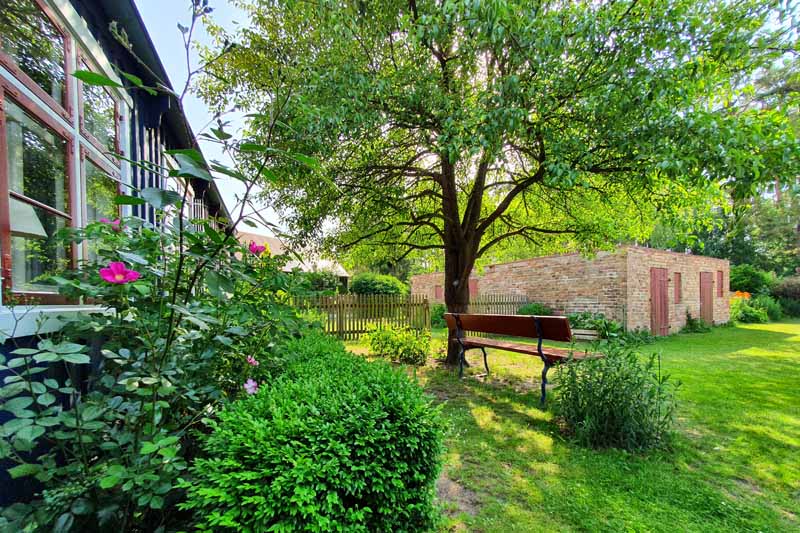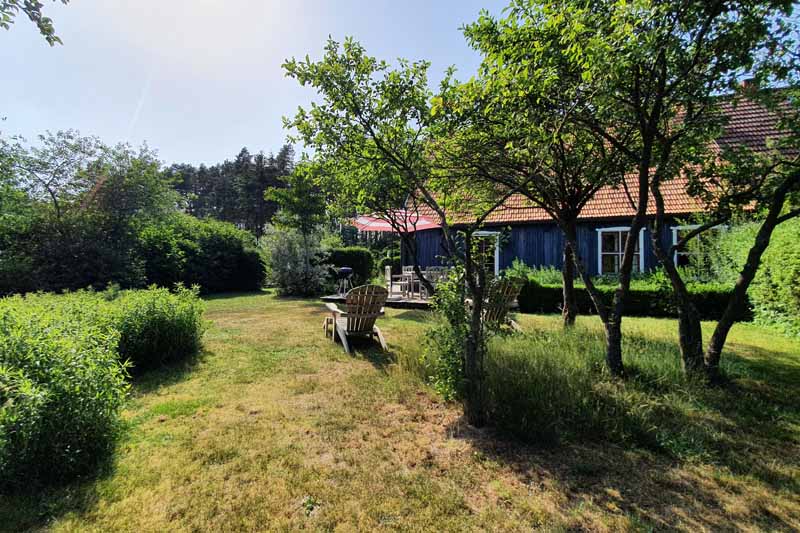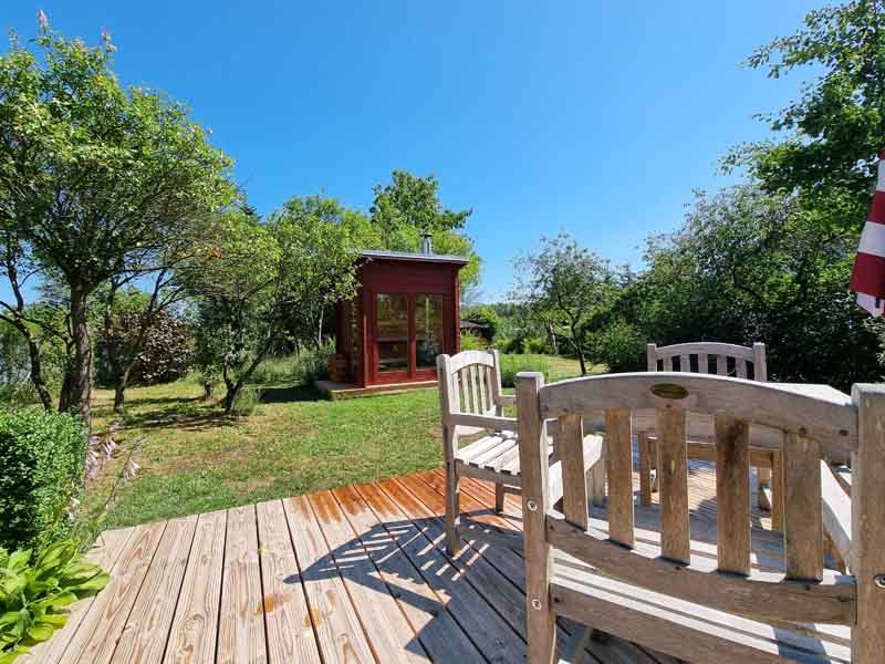 Seit Sommer 2023 erwartet Sie im Garten des Hauses ein kleines Saunahaus mit ausreichend Platz für 2-4 Personen. Die antike Bank unter dem Birnbaum vorm Haus, Teakmöbel auf der großen Holzterrasse und weitere Sitz und Liegemöglichkeiten stehen für Sie zusätzlich zum Entspannen bereit. Von der Terrasse aus schaut man in den wildromantischen Obstgarten mit seinen im Frühling prächtig blühenden Kirsch-, Apfel- und Pfirsichbäumen und gepflegten Hecken, auf eine Spielwiese mit Sandkasten für die Kleinsten und auf ein verlassenes Imkerhaus.