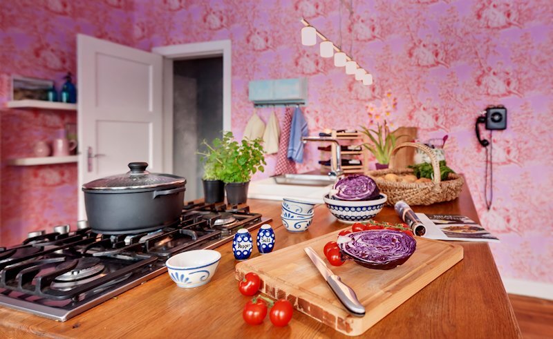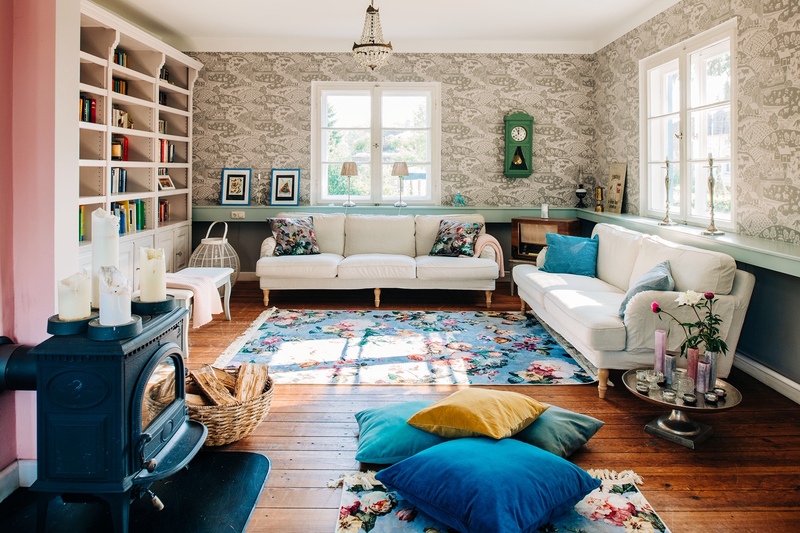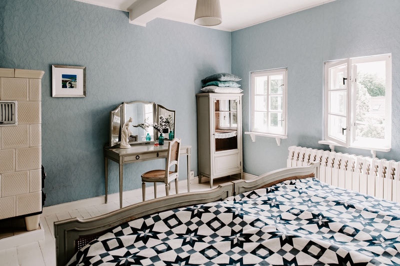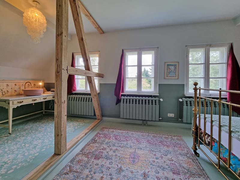 Im Haus erwartet Sie eine besondere Ausstattung mit fast ausschließlich antiken Möbel, welche mit frischen Farben von Farrow & Ball ein charmantes, individuelles Aussehen erhielten. Jeder einzelne Raum des Hauses ist einzigartig, liebevoll und detailreich ausgestattet. Das Haus ist mit insgesamt vier luftigen, hellen Schlafzimmern ausgestattet, mit großen, gemütlichen Doppelbetten, frischen Farben und detailverliebtem Design. Eines der Schlafzimmer liegt im Erdgeschoß, die drei weiteren Schlafzimmer befinden sich im Obergeschoss des Hauses. Das Hauptbad liegt im Erdgeschoss und bietet neben Dusche, WC und wunderbaren marokkanischen Zementfliesen auch einen phantastischen Blick auf die Riether Schlossallee und umgebende Wiesen. Ebenfalls im Erdgeschoß gelegen ist der große Wohnraum mit gusseisernem Kaminofen. Hier wurden Wände entfernt, um einen großen, lichtdurchfluteten Wohnraum zu schaffen, in den auch die elegante Kochinsel und die lange, stimmungsvolle Tafel integriert werden konnten. Von hier aus gelangt man auf die dem Wohnraum vorgelagerte große Holzterrasse mit Sonnenmarkise, einem weiteren großen Essplatz, mit Outdoor Lounge Sitzgruppe und mit Panoramablick auf den riesigen, naturnah gestalteten Garten. Im Obergeschoß des Hauses gibt es zwei weitere Bäder ensuite, eines davon mit Badewanne, und 2 separate Gäste-WCs.