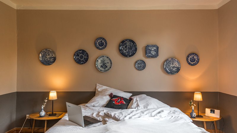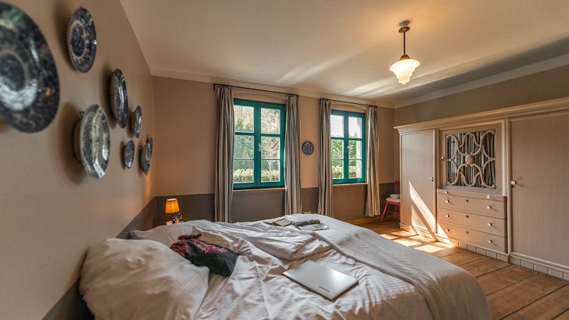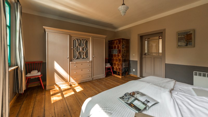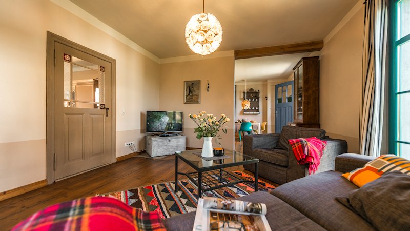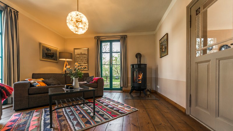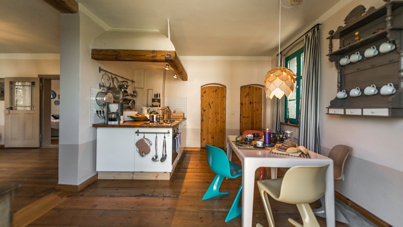 Im Haus erwartet Sie eine sehr individuelle Ausstattung mit sanften Farben, antikem und modernem Mobiliar und mit Kunst, welche auf den ländlichen Charakter des Hofs verweist. Zwei Schlafzimmer für 3 Personen stehen zur Verfügung, das Hauptschlafzimmer ist mit einem Doppelbett, das zweite Schlafzimmer ist mit einem Einzelbett ausgestattet. Der Wohnraum mit gemütlicher Wohnlandschaft, Kaminofen und TV geht nahtlos ins Esszimmer über, welches mit einer Besonderheit ausgestattet ist: eine seltene historische Esse, in die die komplett ausgestattete Küchenzeile integriert wurde. Das kleine, modern ausgestattete Duschbad rundet die Ausstattung des Hauses ab. Überall im Haus und auf der Terrasse steht Ihnen kostenfreies WLAN zur Verfügung. Einige Dinge des Originalinventars des Hauses wie z.B. eine hübsche Jugendstil-Kinderbank tauchten bei Aufräumarbeiten im Zuge der Renovierung wieder auf und konnten für die Neumöblierung verwendet werden.