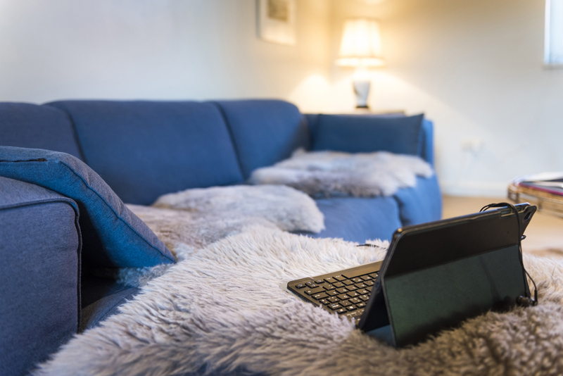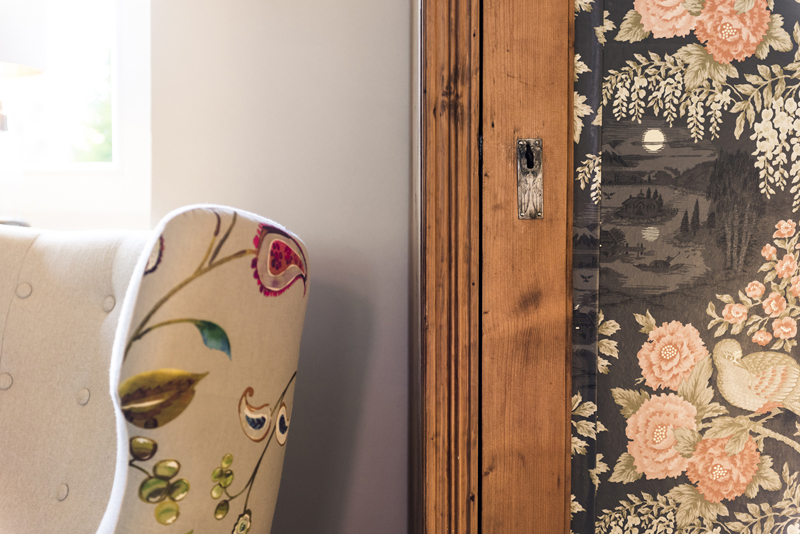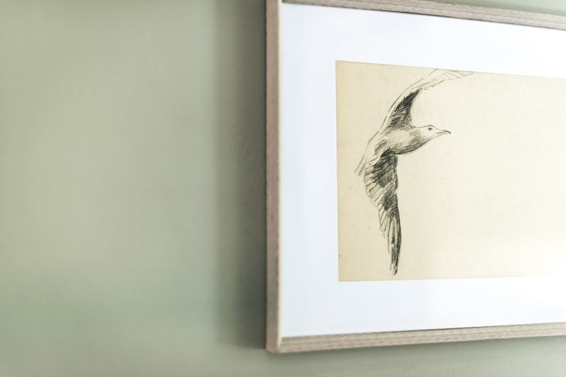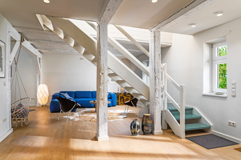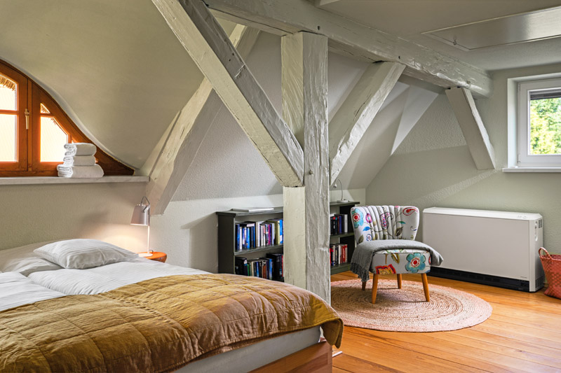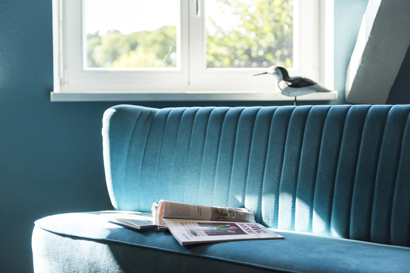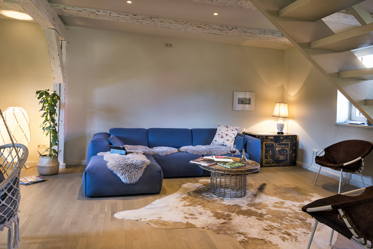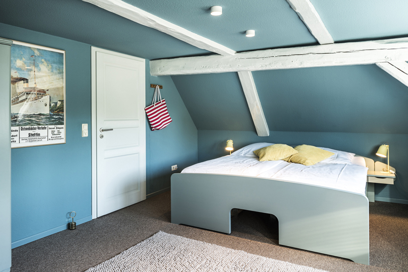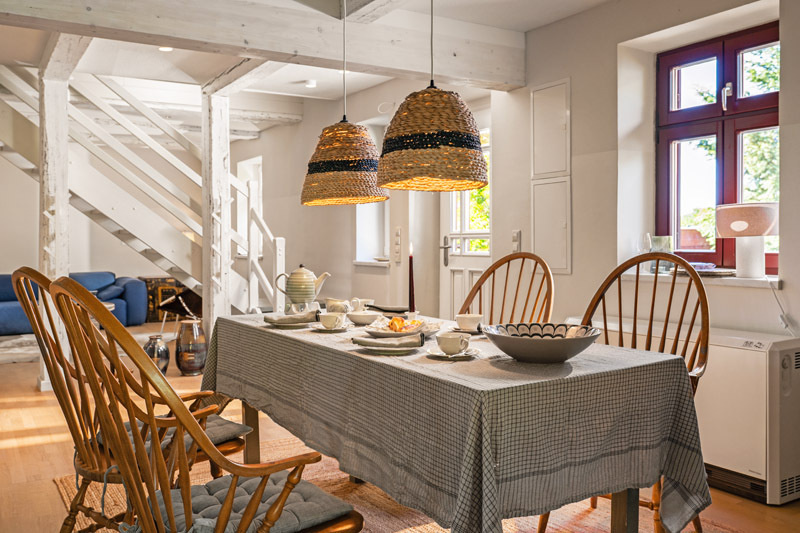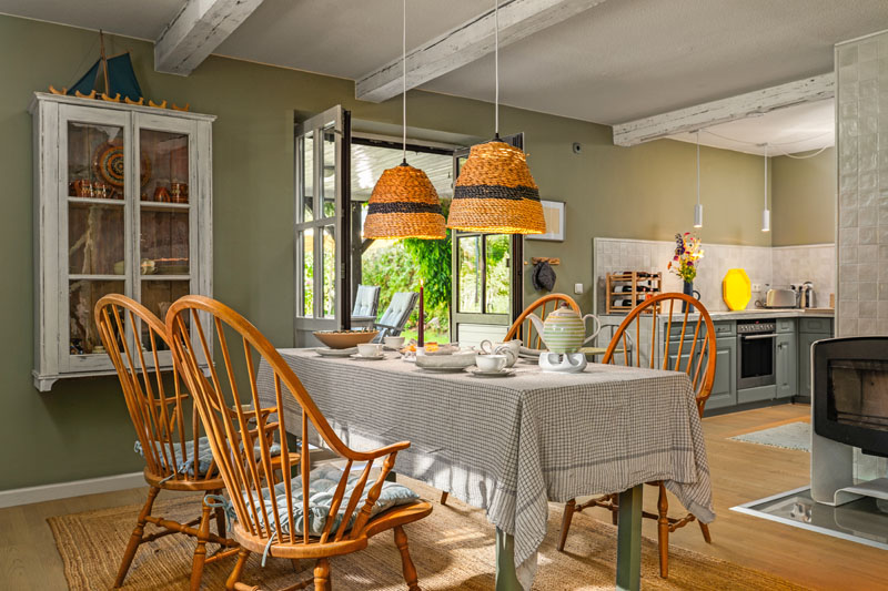 Das Haus empfängt seinen Gast mit einem großen, offenen Wohnraum, auf der einen Seite liegt der gemütliche Wohnbereich mit breitem Loungesofa und Sixties-Designersesseln aus Wildleder, auf der anderen Seite befindet sich der Essplatz mit Kaminofen, vollausgestatteter Küche und Doppelflügeltür zur überdachten Terrasse mit Outdoor-Essplatz. Zwischen den beiden Wohnbereichen liegen das Erdgeschossbad und die galerieartige Treppe ins Obergeschoss. Die beiden Doppelschlafzimmer liegen im Obergeschoss, das zum Wasser hin ausgerichtete blaue Seezimmer und das zum Hof bzw. Garten hingewandte grüne Gartenzimmer, letzteres mit einem Bad ensuite.